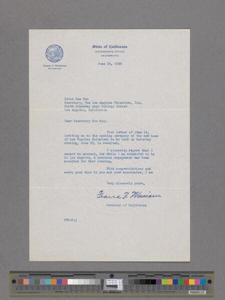 A letter inviting Frank Merriam, Governor of California, to the grand opening ceremonies of New Chinatown planned for the evening of June 25th, 1928.