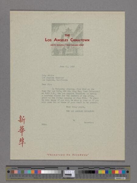 A letter inviting Frank Merriam, Governor of California, to the grand opening ceremonies of New Chinatown planned for the evening of June 25th, 1928.