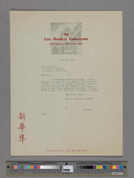 A letter inviting Frank Merriam, Governor of California, to the grand opening ceremonies of New Chinatown planned for the evening of June 25th, 1928.