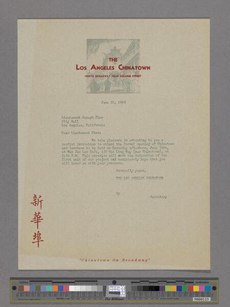 A letter inviting Frank Merriam, Governor of California, to the grand opening ceremonies of New Chinatown planned for the evening of June 25th, 1928.