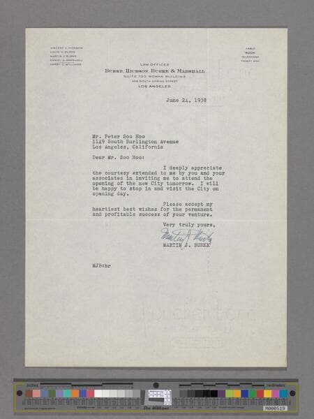 Letter from Peter SooHoo to Lieutenant Joseph Shaw, City Hall, Los Angeles, inviting him to the formal opening and luncheon on June 25th, 1938.