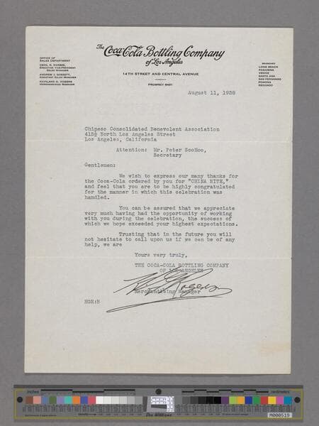 Carbon copy of a letter from Peter SooHoo to R.J. Hadden, Assistant Vice President, Southern California Telephone Company, thanking him for all the assistance given at the opening of New Chinatown.