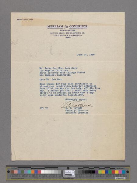 Letter from E.V. Latham, Campaign Director, Southern Counties, Merrriam for Governor, acknowledging receipt of the letter to Governor Merriam.