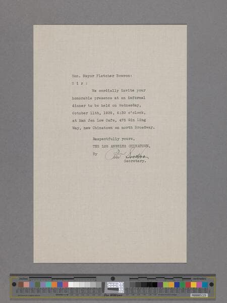 Carbon copy of an invitation from Peter SooHoo to Charles N. Stevens, Police Commissioner, City of Los Angeles, to the opening of New Chinatown.