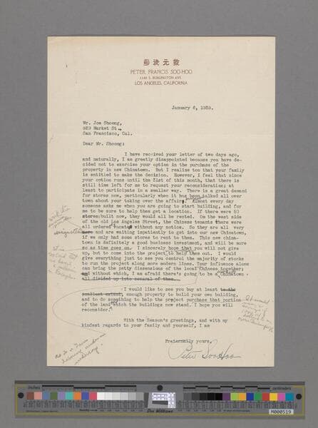 Draft Letter, Peter SooHoo to Joe Shoong