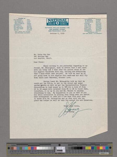 Letter from Joe Shoong to Peter SooHoo, informing SooHoo of a discussion he had with Frank McLaughlin, Head of the Work Projects Administration in California, suggesting that Soohoo and his group get in touch with him. Copy of letter attached.