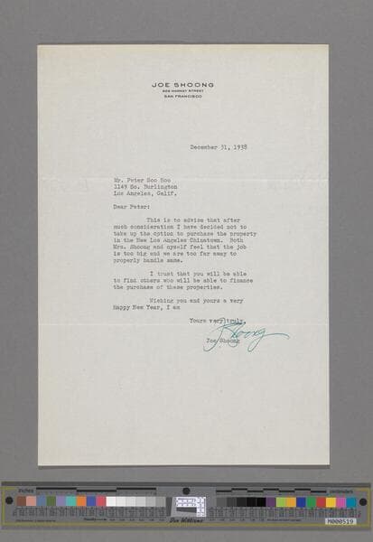 Leter from Joe Shoong to Peter SooHoo stating that SooHoo's leter recived, but further discussion will need to wait until Shoong is in Los Angeles.