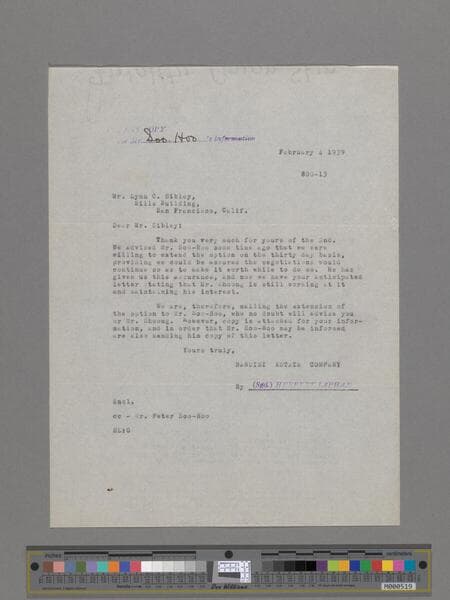 Letter from Herbert Lapham, Bandini Estate Company, to Peter SooHoo regarding extensions on the purchase of property.