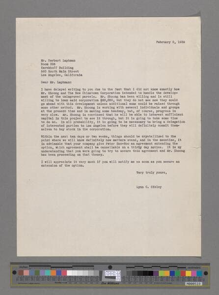 Copy of a letter address to Lynn Sibley from Herbert Lapham, Bandini Estate Company, concerning extension of option to purchase tracts of land adjacent to New Chinatown project. Letter dated January 25 to SooHoo, Quan and Yip attached.