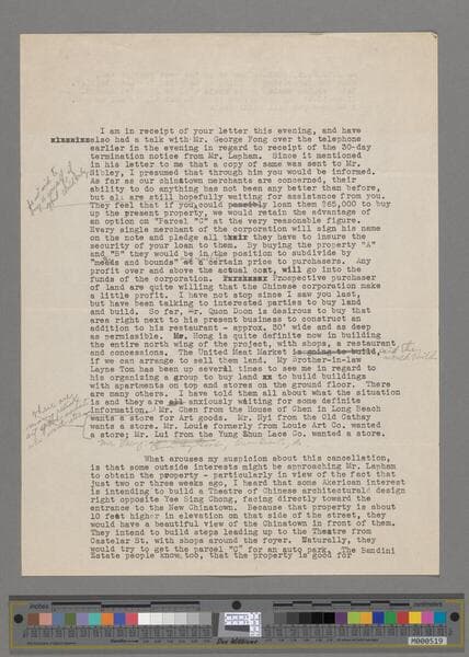 Two drafts of a letter from Peter SooHoo to Joe Shoong,with manuscript corrections, concerning Shoong's decision not to purchase property in New Chinatown.