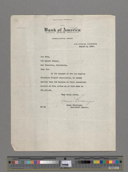 Letter From Miller to SooHoo in response to his asking for support for New Chinatown. She assures SooHoo that she is interested and will help support the project. Miller includes a letter she wrote to Arthur G. Arnoll, Secretary and General Manager of the Los Angeles Chamber of Commerce. She asks Arnoll for his full support for the New Chinatown project as well.