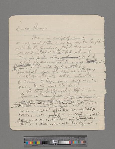 Two drafts of a letter from Peter SooHoo to Joe Shoong,with manuscript corrections, concerning Shoong's decision not to purchase property in New Chinatown.
