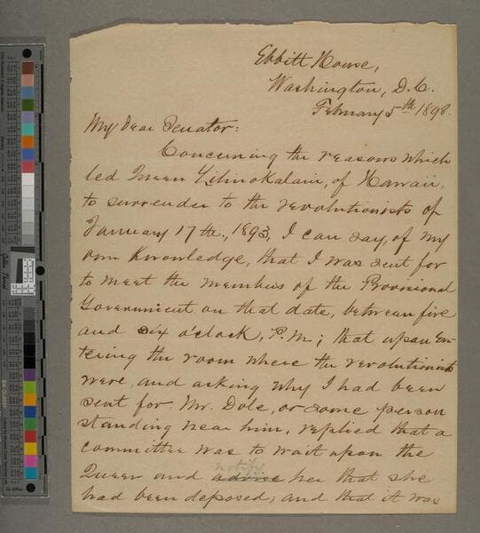The collection consists of 177 letters, two manuscripts, 1 piece of ephemera and 17 newspaper clippings. The majority of the collection is correspondence written to Joseph Oliver Carter (there are only two letters written by him, one of which is to Queen Liliuokalani). Notable participants include: Joseph K. Aea, attorney for the Queen; Calvert T. Bird, attorney for the James Campbell estate; Charles Reed Bishop; J. A. Cummins, Hawaiian royalty and businessman; attorney Clarence Woods DeKnight; journalist Julian Hawthorne; Hawaiian diplomat and politician Curtis Pi'ehu 'Iaukea; Prince David Kawananakoa; William Kinney, Hawaiian businessman; G. W. MacFarlane, attorney for the Queen; reporter Julius A. Palmer; Abigail Campbell Parker, widow of James Campbell and mother of Princess Abigail Kawananakoa; Senator Richard F. Pettigrew; Hawaiian Chief Justice Alexander George Morison Robertson; Hawaiian politician Robert W. Shingle; Hawaiian minister David Willis Keliiokamoku White; Albert Shelby Willis, United States Congressman and Minister to Hawaii; and Charles Burnett Wilson, Marshall of Kingdom of Hawaii and Royal Guard.