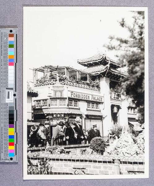 Image of the Seven Star Sacred Caverns and wishing well and pool, Forbidden Palace in background. Printed in the lower corner of the card: Wishing Well - Sacred Seven Star Cavern / Built by / Professor Henry K. Liu / Chinatown on Broadway / Los Angeles.