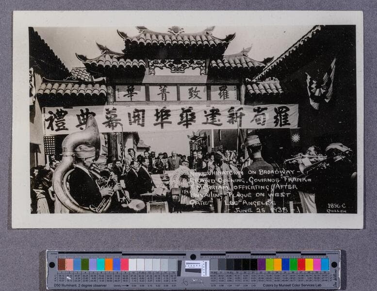 Image of a band playing in front of the West Gate of New Chinatown during the dedication and grand opening. There is a stage set up under the gate, where Peter SooHoo is standing at the microphone. Also on the stage are Los Angeles Mayor Frank Shaw, California Governor Frank F. Merriam, Princess Der Ling, Anna May Wong, and Mr. T.K. Chang, of the Chinese Council.