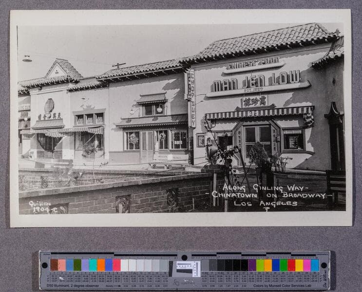 Image of Gin Ling Way looking towards the West Gate. Printed on the postcard at the bottom: Street Scene - Ginling [Gin Ling] Way / L.A. New Chinatown - No. Broadway / Quillen Photo / 1850 - c.
