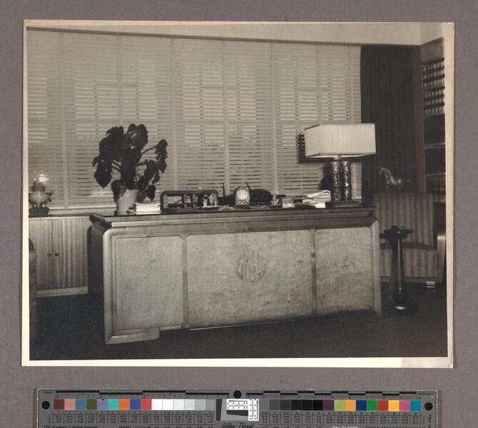 Letter from Honor Easton, interior designer, to Y.C Hong. Enclosed with the letter are 4 images of the interior of Hong's office at his law firm. A fifth image is photographed through the East Gate looking toward the firm's building in New Chinatown.