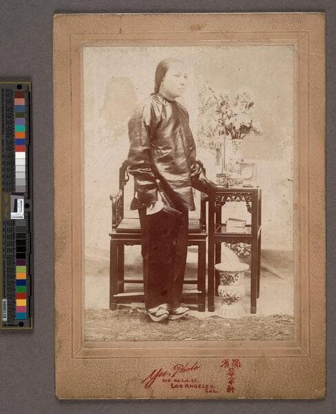 This collection contains photographs of Los Angeles' Old Chinatown and portraits of its Chinese residents, most dating from the 1890s to the 1900s. Together there are 299 glass plate negatives ranging in size from 3 1/4 x 4 1/4 inches to 8 x 5 inches; an ornate photograph album containing 12 studio portraits of Chinese men and women; and six additional card photograph portraits. Some printed photographs have the imprints of professional photographers and a few of the glass plate negatives are credited to "Yee Photo, L.A. Cal." They may be connected to a photographer "Yee" who at one time had a studio at 510 North Los Angeles Street in Old Chinatown (see photograph Box 8 (1)). This could possibly be Wy Yee, a photographer working during the same time period. It is unclear if he took all the photographs or there was more than one photographer. There are two glass plate images of a photographer's storefront with a sign in Chinese that translates to Jinghua Photo Studio. Scenes in Old Chinatown include: street views of buildings and storefronts; Chinese and a few white people walking in the streets; the interior of a restaurant and three Chinese workers posing for the camera; two men on bicycles; the Chinese community participating in La Fiesta de las Flores parade; and other candid photographs of people in daily activities. Some buildings have store signs in English and Chinese. The majority of photographs are portraits of primarily Chinese sitters. Several are posed studio portraits of men, women, or children, wearing traditional Chinese or western clothing, with elaborate props and backdrops. Other portraits are simple head shots of Chinese men, one of which has the handwritten date "1902," the year that the Chinese Exclusion Act of 1882 was made permanent and required Chinese residents to register and obtain immigration documents. Other photographs include: three studio images of women showing bare shoulders, a Chinese woman posing in a sailor's uniform, and white tourists posing in traditional Chinese clothing. Photographer imprints on card photographs are: Bijou Studio, James Blanchard, George Dewey, J. H. Lamson Company, Michael A. Wesner, and "Yee," who may be photographer Wy Yee, all of Los Angeles. There is one portrait of a Chinese woman by William Shew, San Francisco. The China subseries consists of copies of photographs taken in China, including landmarks and scenes of punishment. Please note that this subseries contains historical images that library users may find harmful, offensive, or inappropriate. Miscellaneous photographs include images of Native Americans and a town in the Southwest.