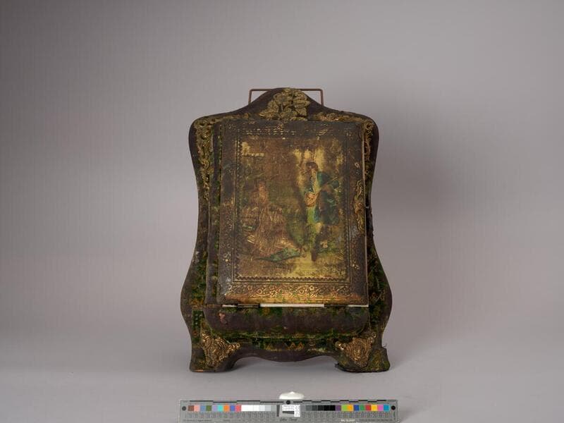 A commercial photograph album published by T. Moriya, Yokohama, Japan, containing 50 hand-colored photographs of scenes in Beijing and Tianjin following the Boxer Uprising in China. The album has decorative lacquered covers and folds out accordion style, with commercially-made photographs mounted on both sides of the leaves. It was most likely created as a souvenir album for the international military forces of the Eight-Nation Alliance that took part in the suppression of the Boxer Rebellion in 1900. All photographs have printed captions in English in the negative, and most have handwritten descriptions in French below the photographs, indicating the previous owner may have been a French officer or soldier who took part in the crisis. Images include famous sites in Beijing and Tianjin, some of which are partly ruined; group portraits of international soldiers and marines; and three images of the execution (beheading) of Chinese Boxers. One photograph shows the Catholic Church of Our Lady of Victory in Tientsin, which burned down after the Allies' bombardment in 1900, accompanied by an extensive handwritten note in French in the margin.