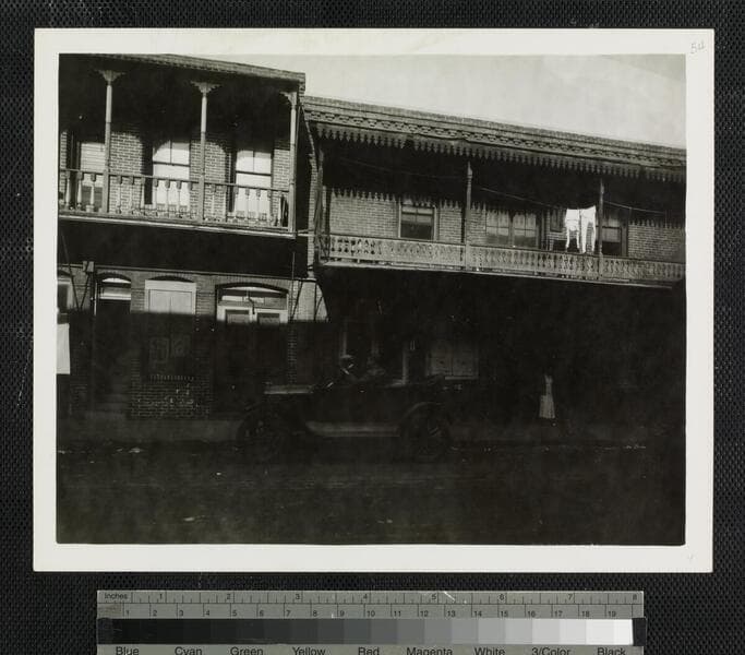 View of attached brick two-story buildings, with balconies and drying laundry, on Apablasa Street in Old Chinatown, Los Angeles, with automobile in front. Building at left reads Chee Kung Tong Co. 1900, and the windows below read "Hoy Sun Ning Yung Benevolent Association".