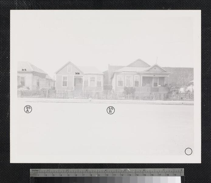 View of houses with fenced-in yards on Bauchet Street near Old Chinatown, Los Angeles.