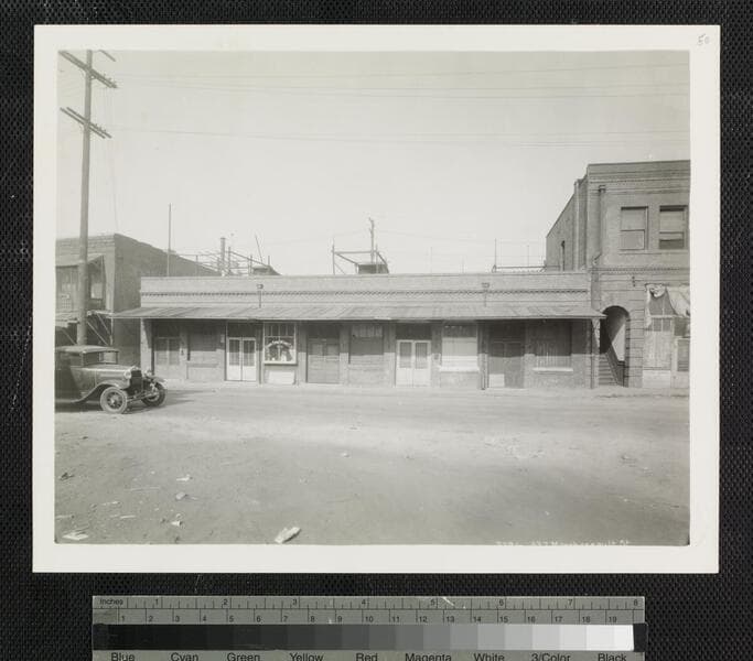 View of two story attached brick buildings, two with awnings, on Marchessault Street in Old Chinatown, Los Angeles, with an automobile at right. Advertising on the buildings at the left reads Yee Sing Chong Co. Merchandise.