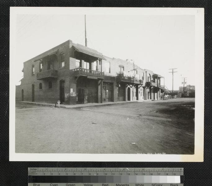 View of street corner with two-story brick buildings on Apablasa Street at the corner of Juan Street in Old Chinatown, Los Angeles.