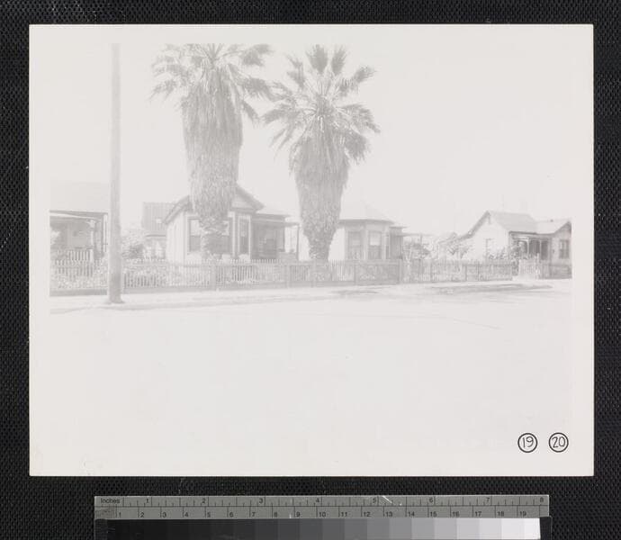 View of houses with fenced in yards and garages on Ogier Street near Old Chinatown in Los Angeles.