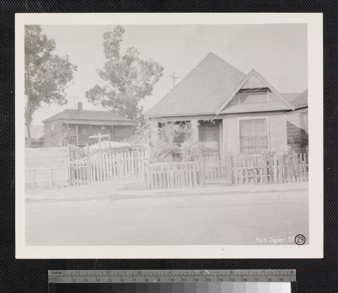 View of houses with fenced-in yards and trees on Ogier Street near Old Chinatown in Los Angeles.