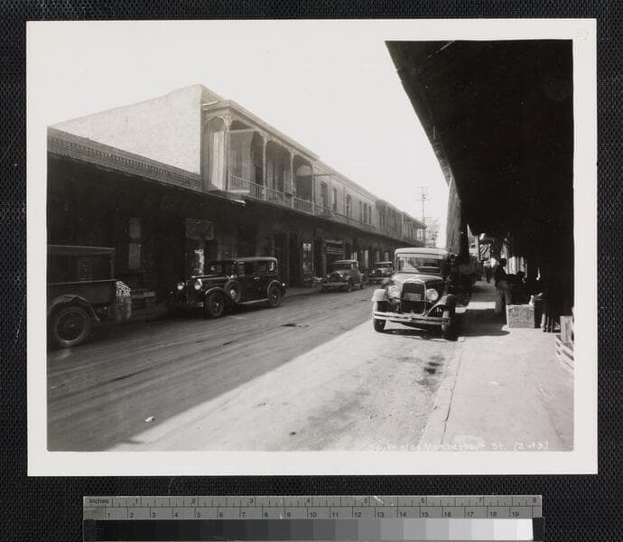 This collection contains 131 black-and-white photographs (including some duplicates) of views of building exteriors and streets scenes in Old Chinatown and neighboring residential and industrial areas of downtown Los Angeles, California, that were taken prior to the demolition of the area beginning on December 23, 1933, to make way for the Los Angeles Union Station railroad terminal. The photographs consist of eye-level street views focused on the area of downtown Los Angeles, around Apablasa Street (spelled Apalabasa or Apalabassa on the images), that was bordered by Alameda Street to the west, Aliso Street to the south, Date and College Streets to the north, and Lyon to the east. The views include images of industrial and commercial areas; retail storefronts; warehouses; manufacturing; utility and railroad buildings; houses and apartments with balconies; dirt streets and alleys; children; automobiles; and dilapidated and vacant buildings. The signage on retail buildings often reflects the Chinese and Hispanic heritage of residents and shop owners in the area. The photographer is unidentified, but presumably the photographs were created to aid in planning for the project, perhaps as part of the process of determining property valuation.