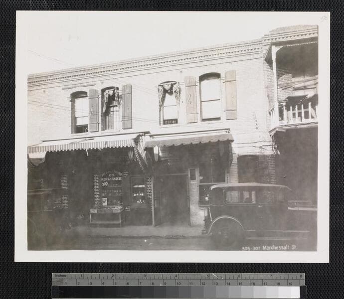 View of two-story attached brick buildings, one with a balcony with potted plants, on Marchessault Street in Old Chinatown, Los Angeles, with automobiles on street. Sign on one car reads Chun Sang Market Meat Wholesale and Retail.