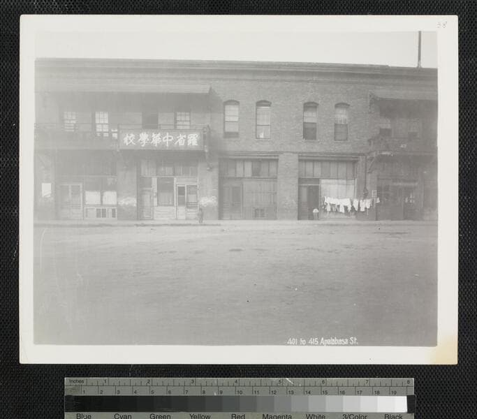 View of two-story attached brick buildings and automobiles on Apablasa Street in Old Chinatown, Los Angeles. The building at left has decorative finishes and awning and reads Chee Kung Tong Co. 1900. Building at right has laundry hanging on balcony.
