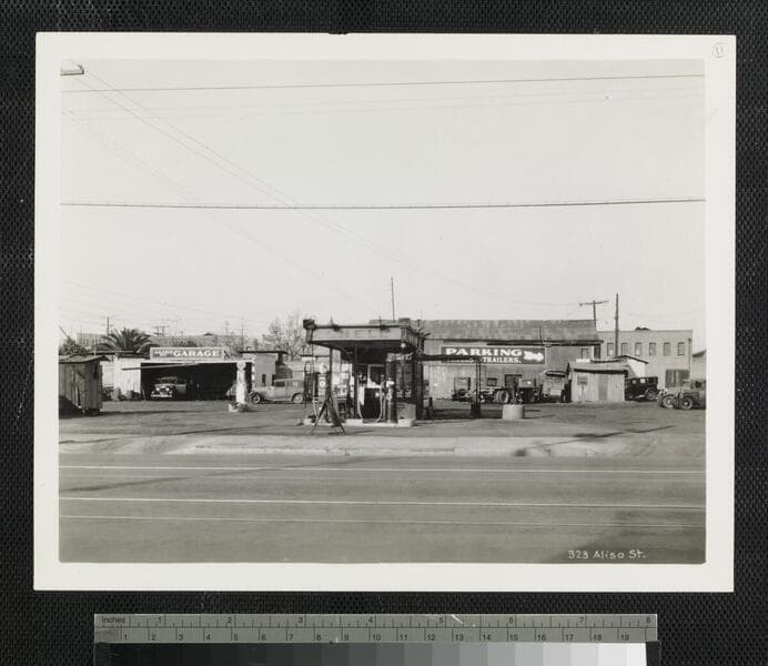 View of brick buildings housing businesses and a General gas station on Aliso Street near Old Chinatown, Los Angeles, with automobiles on the street. The businesses include the Pacific Trunk Factory, U.S. Bag & Supply Co. and American Toy Manufacturing Co.