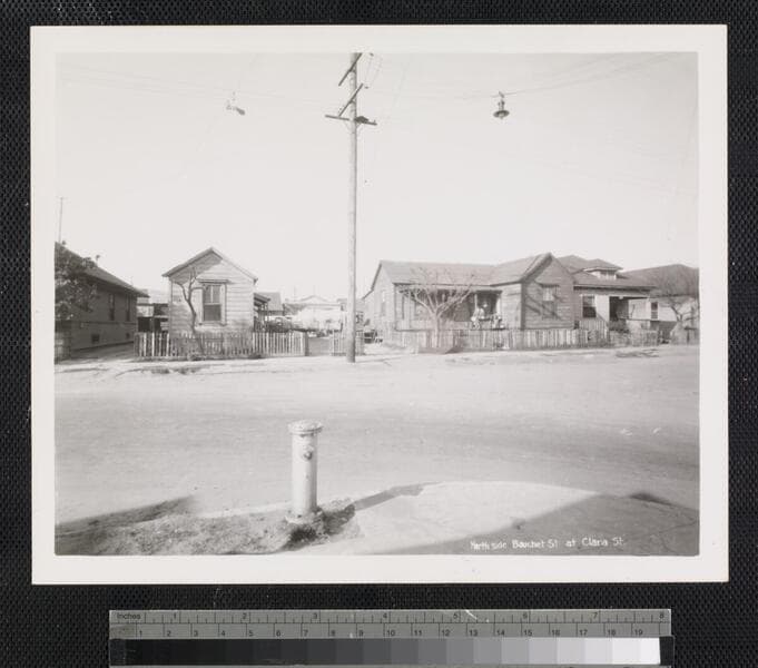 View of houses with fenced-in yards and trees on Bauchet Street near Old Chinatown in Los Angeles, with an automobile and a wagon visible.