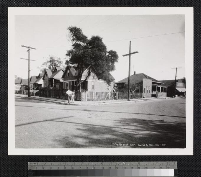View of houses with fenced-in yards and trees, as well as two boys standing at center and a business at the far right viewed from the corner of Avila Street and Bauchet Street near Old Chinatown in Los Angeles.