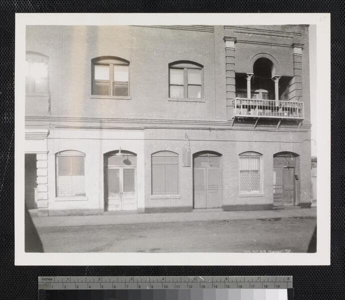View of attached brick two-story buildings, with balconies and drying laundry, on Apablasa Street in Old Chinatown, Los Angeles, with automobile in front. Building at left reads Chee Kung Tong Co. 1900, and the windows below read "Hoy Sun Ning Yung Benevolent Association".