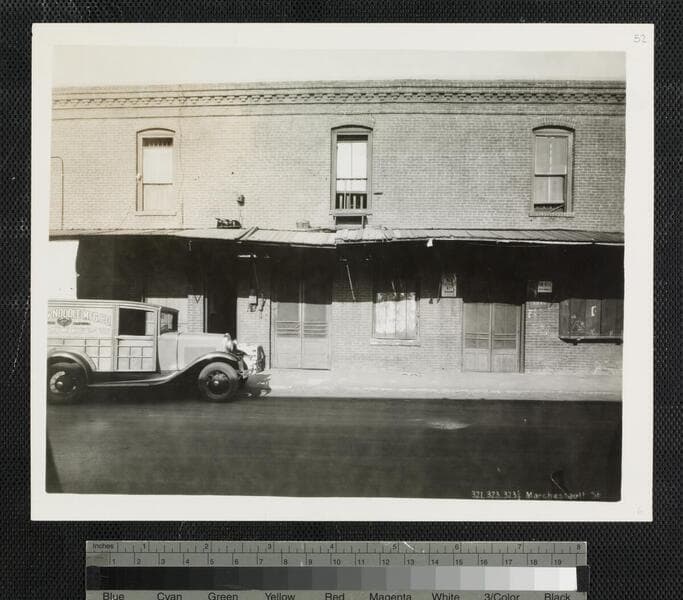 View of two story attached brick buildings, two with awnings, on Marchessault Street in Old Chinatown, Los Angeles, with an automobile at right. Advertising on the buildings at the left reads Yee Sing Chong Co. Merchandise.