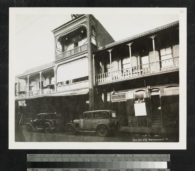 View of brick two-story buildings, with balconies, on Marchessault Street in Old Chinatown, Los Angeles, with automobiles. There are crates of vegetables in front of some storefronts and a meat market in the middle of the photograph.