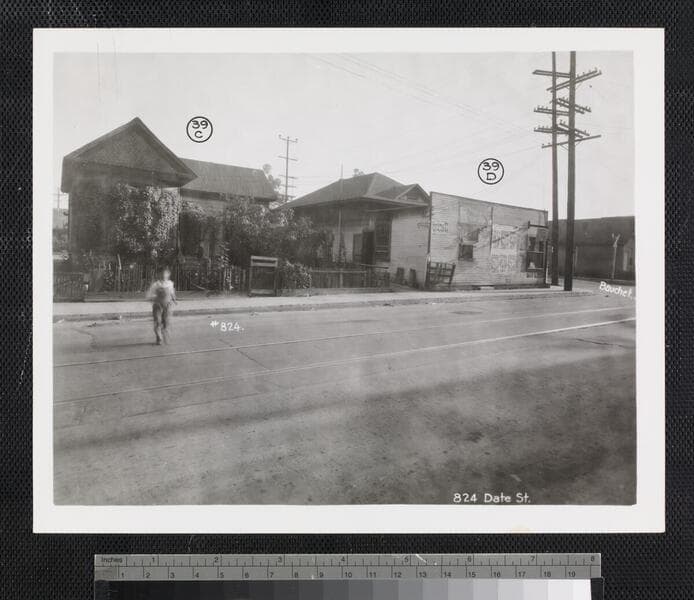 This collection contains 131 black-and-white photographs (including some duplicates) of views of building exteriors and streets scenes in Old Chinatown and neighboring residential and industrial areas of downtown Los Angeles, California, that were taken prior to the demolition of the area beginning on December 23, 1933, to make way for the Los Angeles Union Station railroad terminal. The photographs consist of eye-level street views focused on the area of downtown Los Angeles, around Apablasa Street (spelled Apalabasa or Apalabassa on the images), that was bordered by Alameda Street to the west, Aliso Street to the south, Date and College Streets to the north, and Lyon to the east. The views include images of industrial and commercial areas; retail storefronts; warehouses; manufacturing; utility and railroad buildings; houses and apartments with balconies; dirt streets and alleys; children; automobiles; and dilapidated and vacant buildings. The signage on retail buildings often reflects the Chinese and Hispanic heritage of residents and shop owners in the area. The photographer is unidentified, but presumably the photographs were created to aid in planning for the project, perhaps as part of the process of determining property valuation.