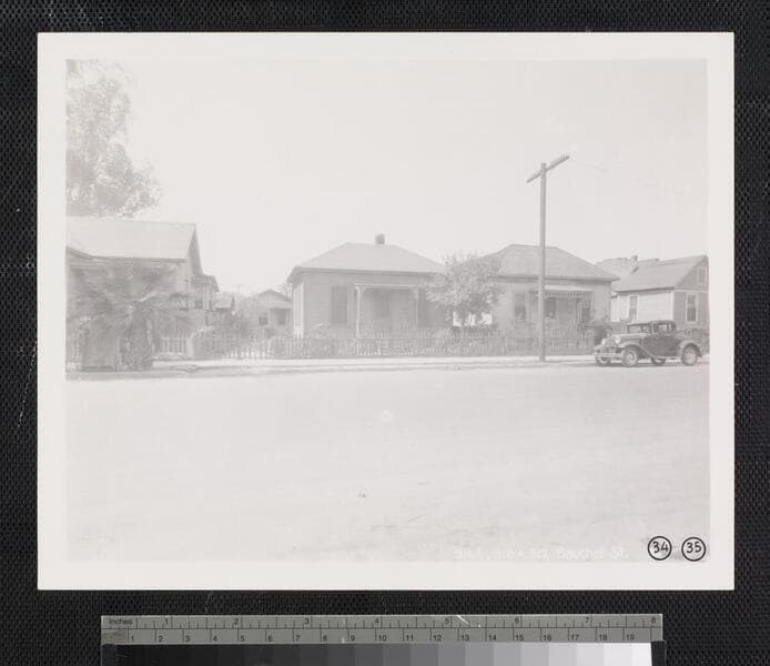 View of houses with fenced-in yards on Bauchet Street near Old Chinatown, Los Angeles.