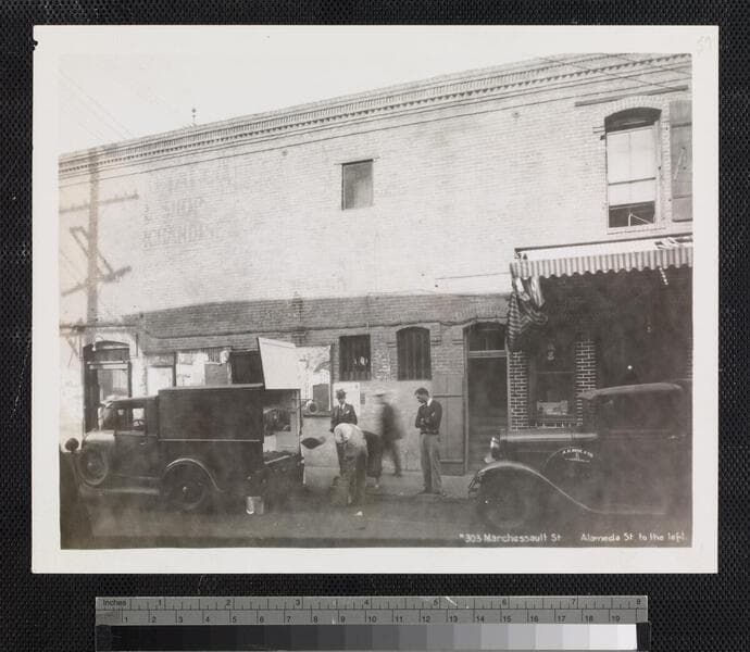 This collection contains 131 black-and-white photographs (including some duplicates) of views of building exteriors and streets scenes in Old Chinatown and neighboring residential and industrial areas of downtown Los Angeles, California, that were taken prior to the demolition of the area beginning on December 23, 1933, to make way for the Los Angeles Union Station railroad terminal. The photographs consist of eye-level street views focused on the area of downtown Los Angeles, around Apablasa Street (spelled Apalabasa or Apalabassa on the images), that was bordered by Alameda Street to the west, Aliso Street to the south, Date and College Streets to the north, and Lyon to the east. The views include images of industrial and commercial areas; retail storefronts; warehouses; manufacturing; utility and railroad buildings; houses and apartments with balconies; dirt streets and alleys; children; automobiles; and dilapidated and vacant buildings. The signage on retail buildings often reflects the Chinese and Hispanic heritage of residents and shop owners in the area. The photographer is unidentified, but presumably the photographs were created to aid in planning for the project, perhaps as part of the process of determining property valuation.
