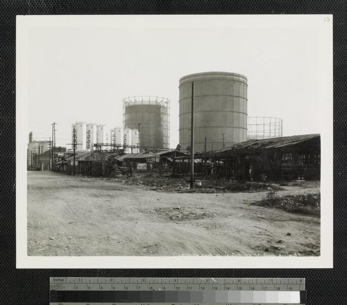 View of attached brick two-story buildings, one with potted plants on balcony, on Juan Street, as viewed from Marchessault Street, in Old Chinatown, Los Angeles. Storage tanks of the Los Angeles Gas and Electric Corporation are in the background.