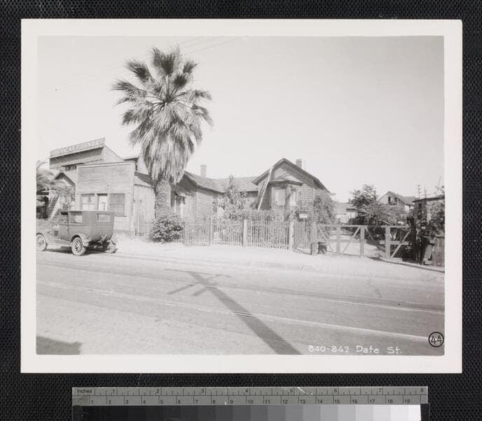 View of houses with fenced-in yards and large palm tree on Date Street near Old Chinatown, Los Angeles.