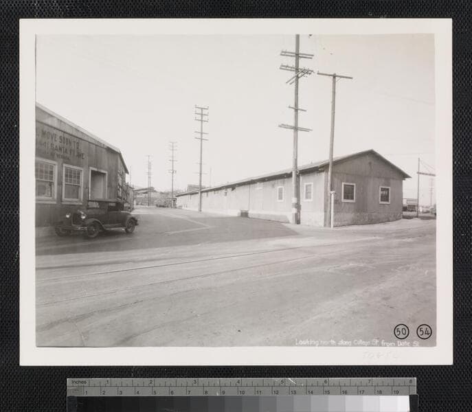 View of the corner of Date Street and College Street near Old Chinatown in Los Angeles, with an automobile and the Standard Pipe and Supply Co. and other industrial buildings visible.