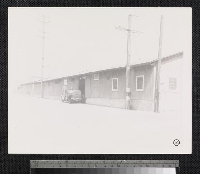 View of the corner of Date Street and College Street near Old Chinatown in Los Angeles, with an automobile and the Standard Pipe and Supply Co. and other industrial buildings visible.