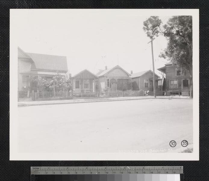 View of houses with fenced-in yards on Bauchet Street near Old Chinatown in Los Angeles.