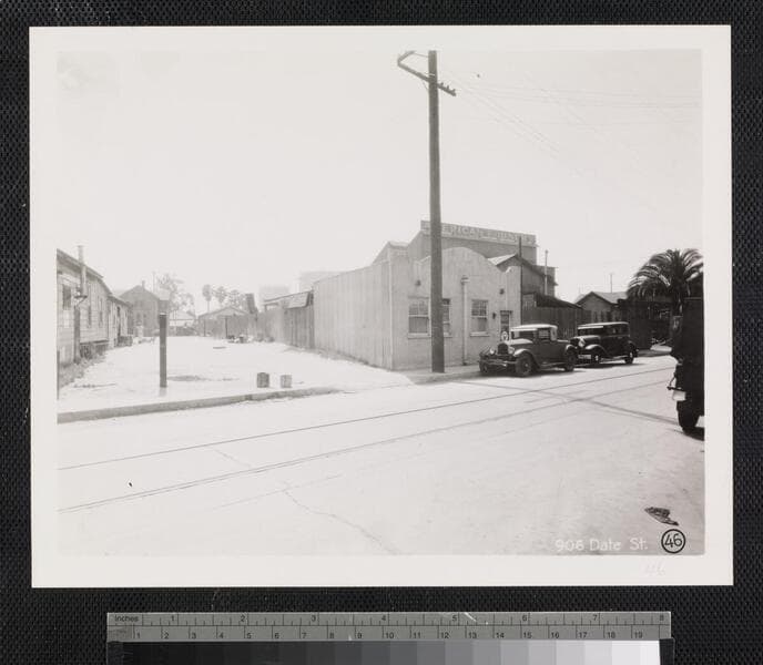 View of houses with palm trees, and automobiles on Date Street near Old Chinatown in Los Angeles. The American Foundry is at the left of the photograph.