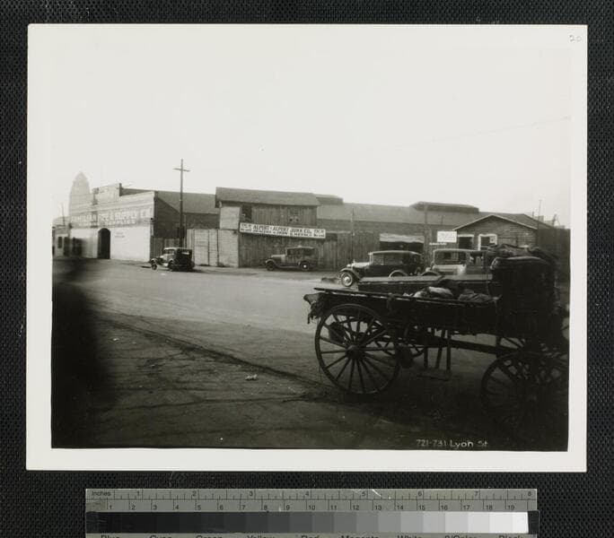 View of a wooden building housing the Alpert & Alpert Junk Co. business on Lyon Street near Old Chinatown in Los Angeles. Automobiles are parked on the street and on the property and there are palm trees that appear to be on the property.