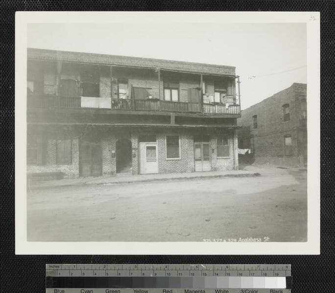 View of two-story attached brick buildings, with balconies and drying laundry, on Apablasa Street in Old Chinatown, Los Angeles. Two automobiles are parked in front and there is a tree planted at the edge of the sidewalk.