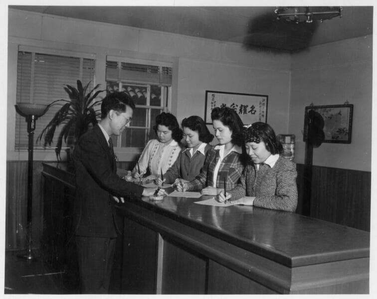 This is a photograph of an unidentified employee in Y. C. Hong's law office at 74 1/2 North Alameda St. in Los Angeles.